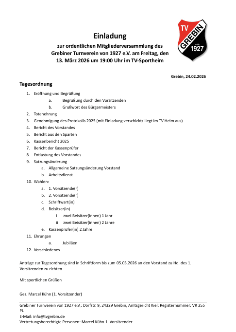 am 13.03.2026, 19.00 Uhr ins Vereinsheim des TV Grebin ein.